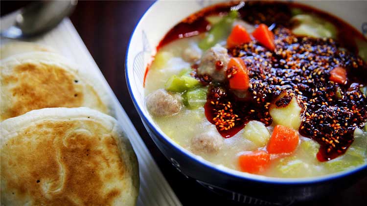 來西安,早上一定不要錯過一碗熱氣騰騰、椒麻咸香的糊辣湯,這是西安人的最愛,而且很火爆。它是用牛羊骨熬湯,加入了現做的牛肉丸,渾圓Q彈,里面還有土豆、圓白菜、胡蘿卜、牛肉粒、豆角等,用大量的胡椒粉調味,然后勾芡而且。