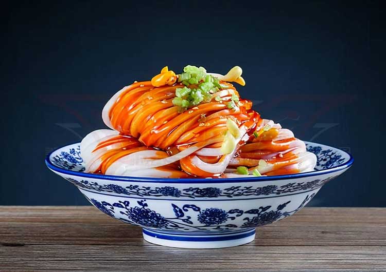陜西秦鎮涼皮距今已有2000多年的歷史,它是由小麥面粉、還有米粉制作而成,用料考究,拌入紅紅的辣椒油,能夠熱吃、涼拌,還能熱炒,吃法多樣,口味酸香鮮辣,順滑Q彈,備受食客喜歡,而且在西安是很接地氣的。